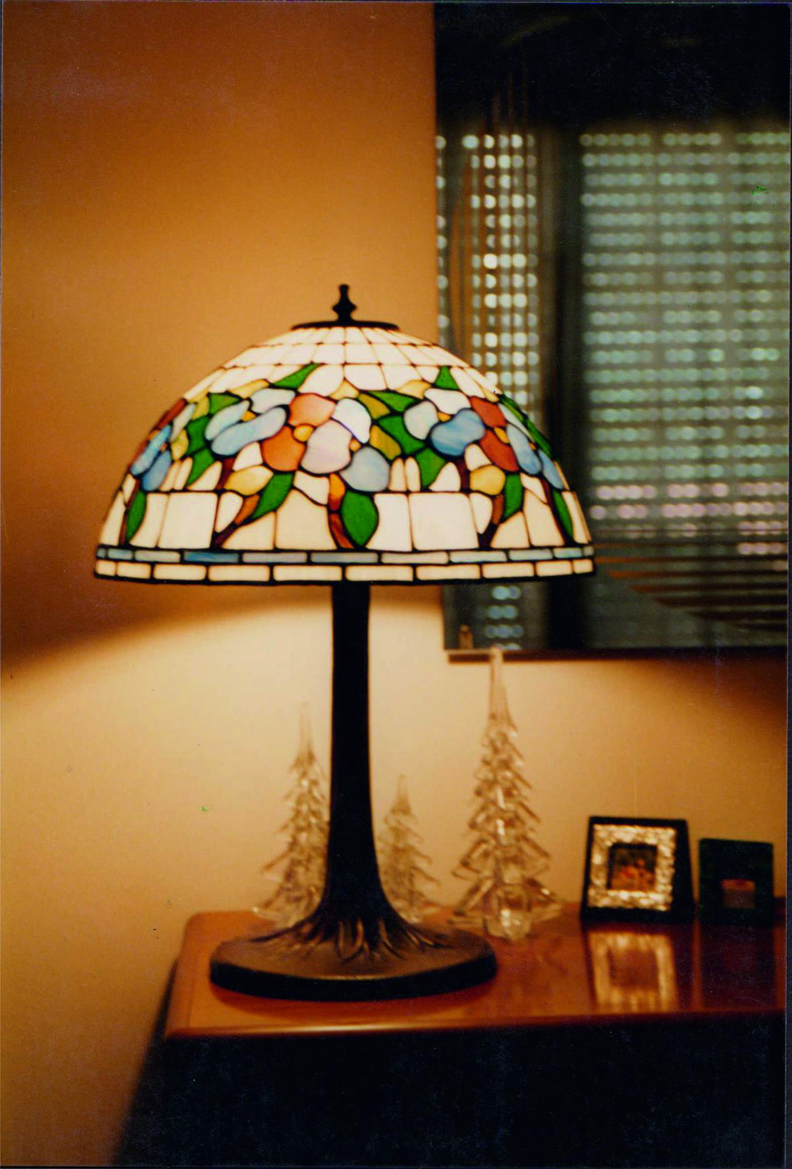 Lampada tiffani floreale di media dimensione realizzata con vetri bellissimi dai riflessi particolari.